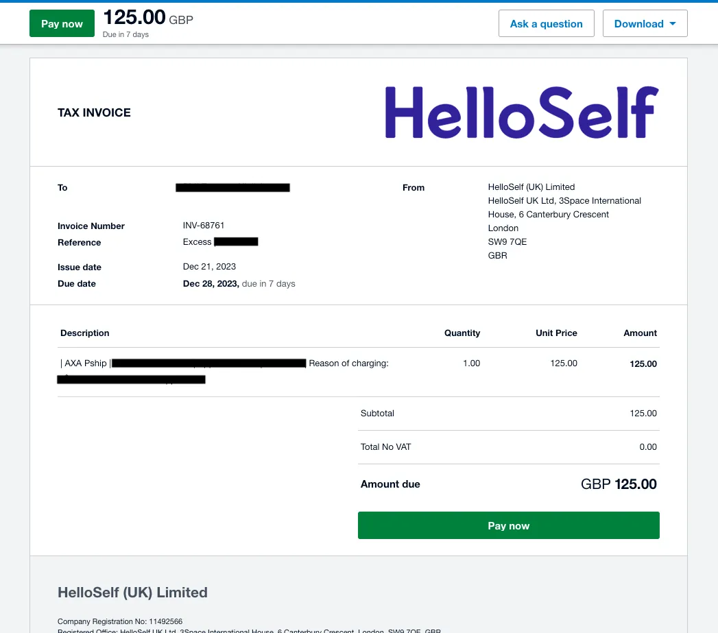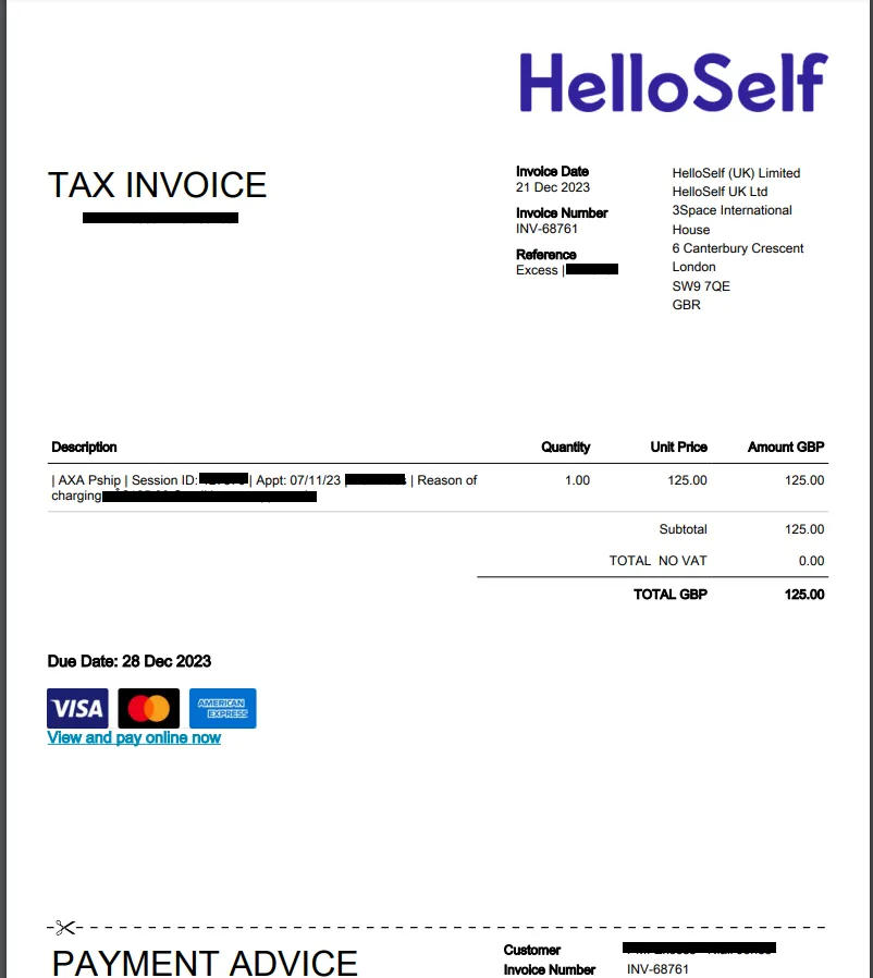 Below is an example of an Excess Invoice / Self funded member invoice. You have options to make a one off payment via ‘View and pay online now’. Or if you have a Direct debit, payment will be taken by the due date on the invoice.